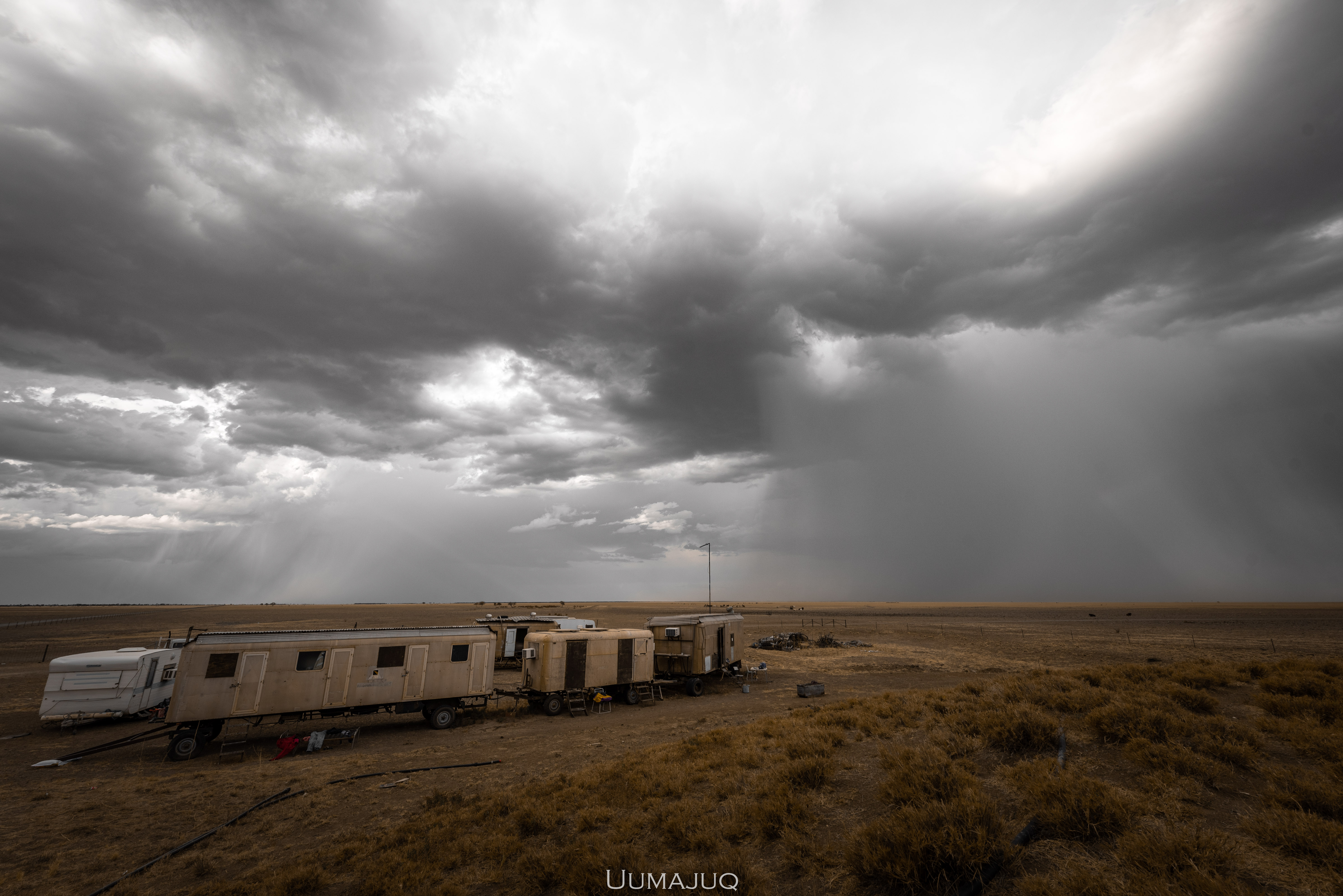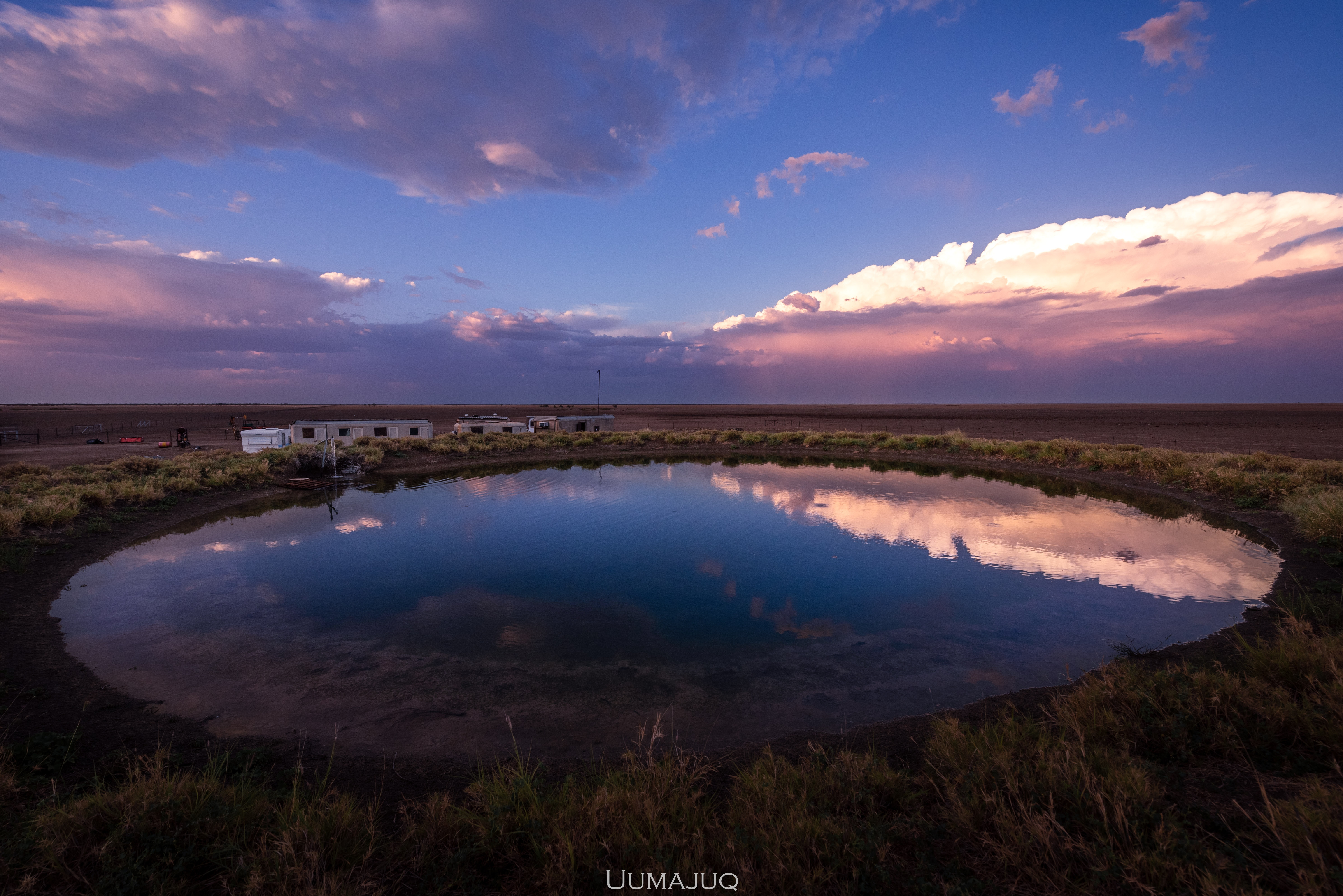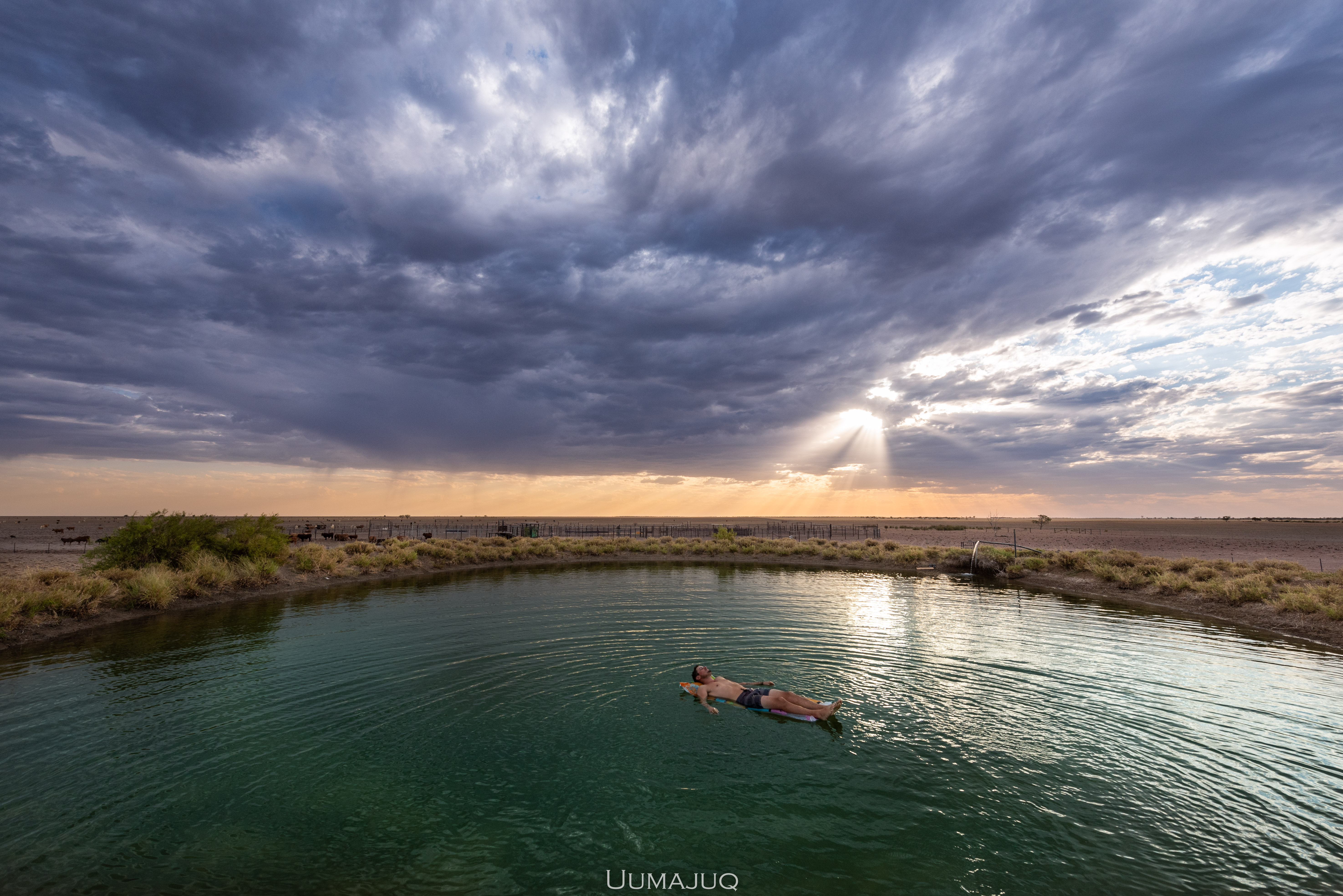 Nous sommes logés dans un camp à la Mad Max, dans une petite caravane avec l’air conditionné – un vrai luxe à cette période puisque l’on rentre dans la saison humide, pendant laquelle les températures descendent rarement en dessous de 30°C, même la nuit. Heureusement pour nous, le camp, aussi sommaire soit-il, est très bien aménagé et on a même une piscine privée (qui est en fait un étang de réserve permettant d’approvisionner en eau les parcelles alentours… Mais aussi notre réserve d’eau. Oui oui, on boit la même eau que les vaches, et il n’est pas rare de trouver quelques algues dans notre bouteille quand on fait le plein !).