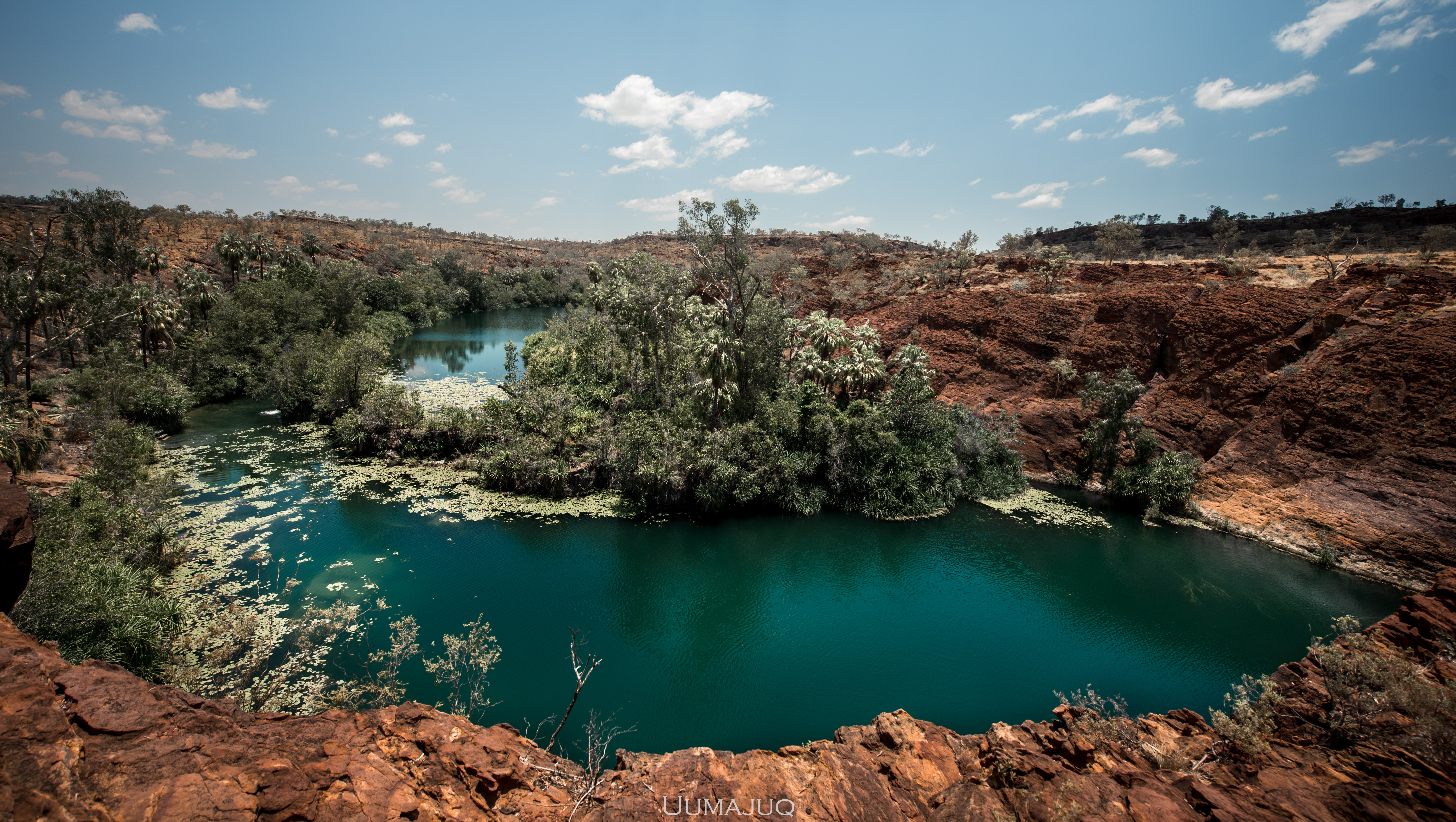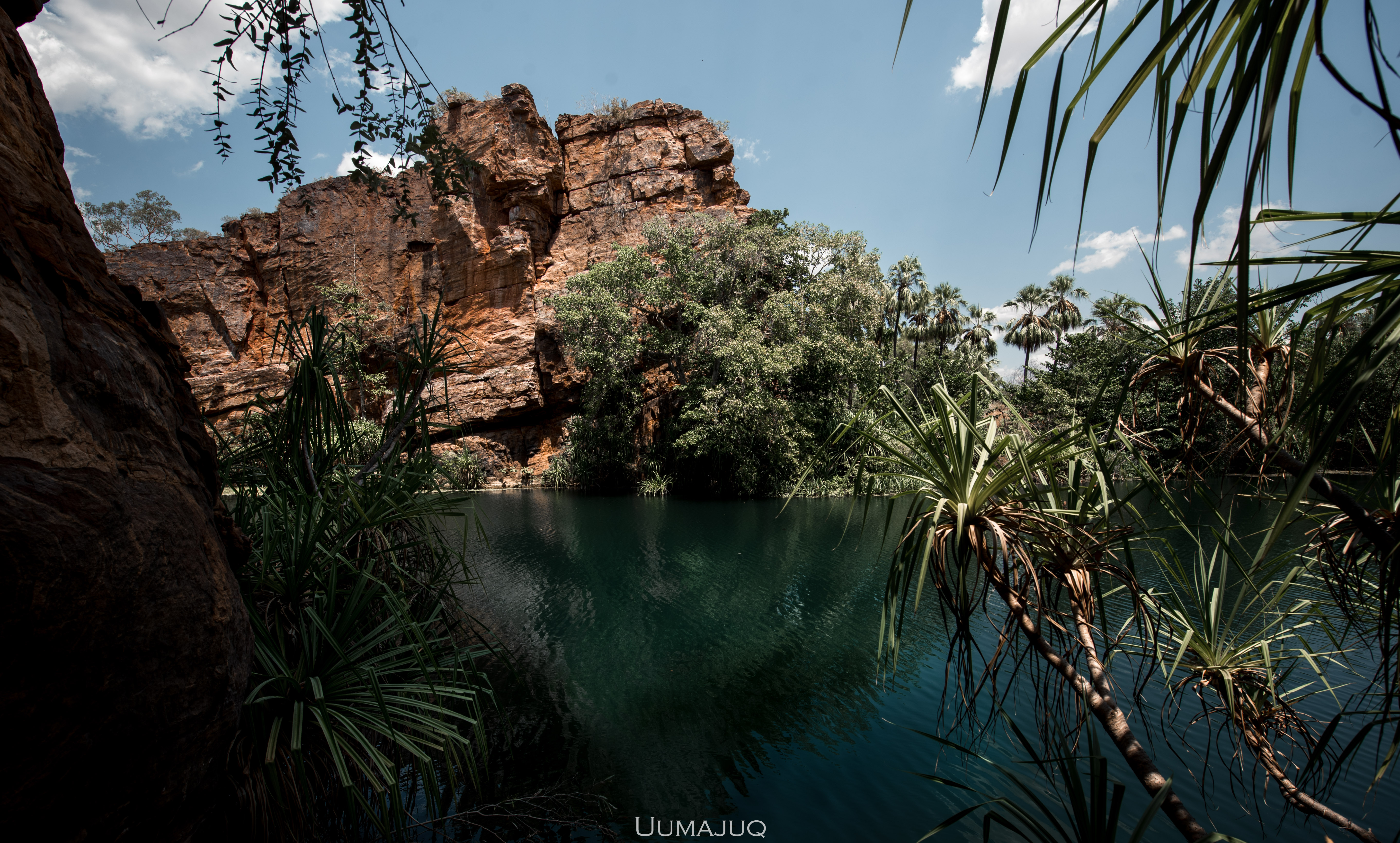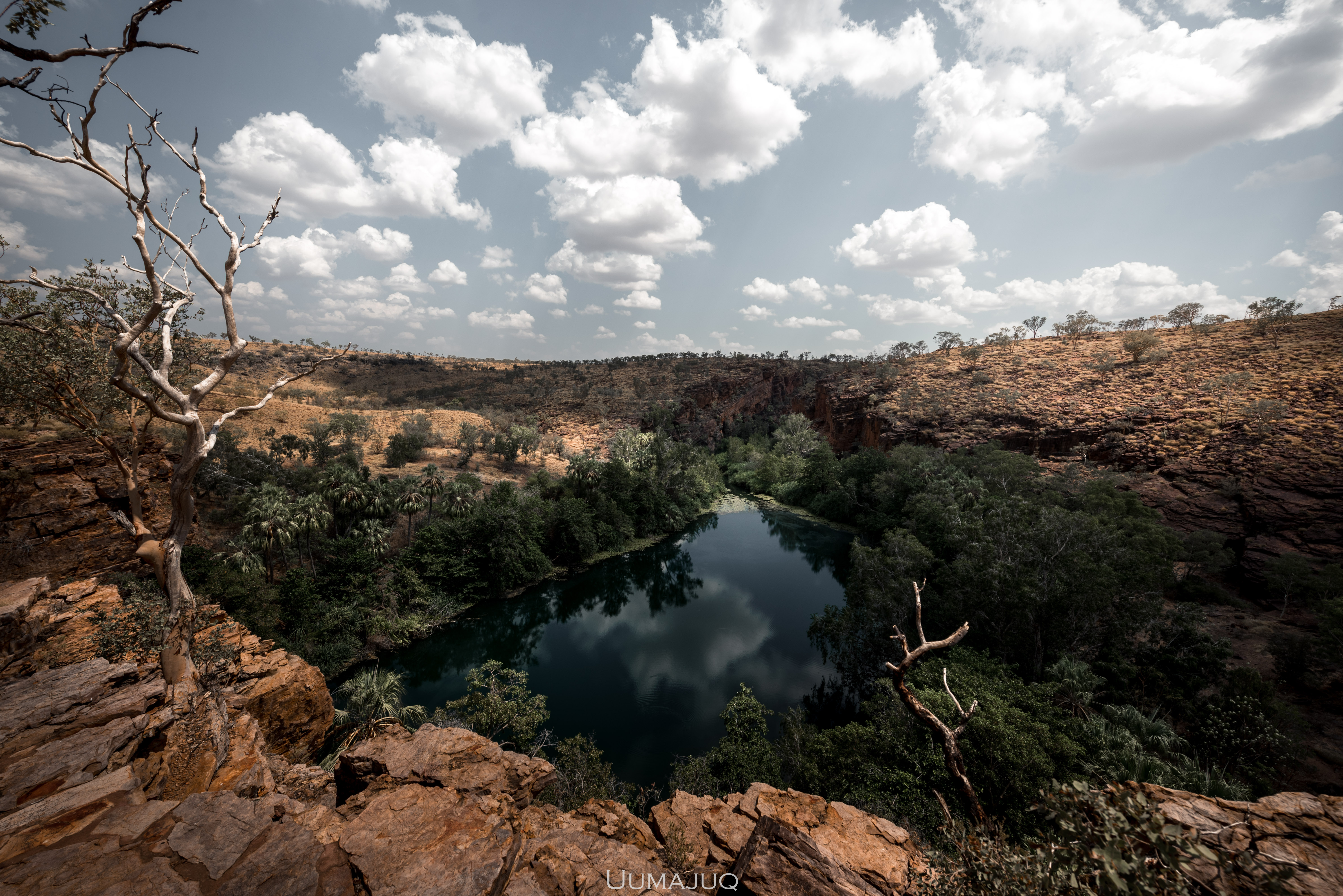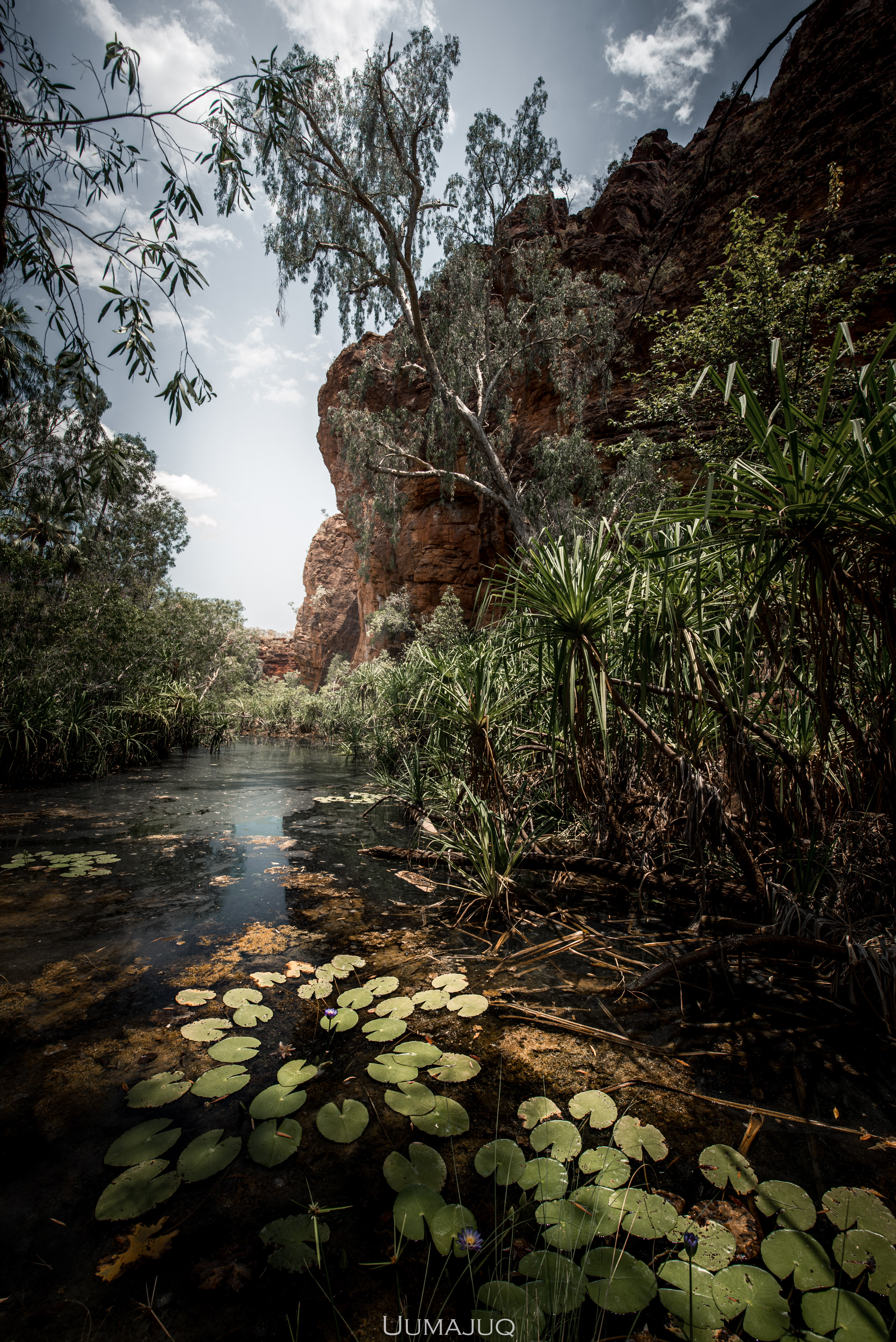Après deux mois intenses, nos corps sont douloureux et nos esprits ont soif d’aventures nouvelles, il est temps pour nous de quitter le camp pour voguer vers d’autres horizons. Notre choix se porte sur le parc national de Boodjamulla (Lawn Hill), situé à environ 300 kilomètres au nord de Camooweal. On vous l’accorde, la saison humide n’est sûrement pas le moment idéal pour découvrir cet oasis. Les températures ressenties atteignent maintenant 50°C en journée, restent au dessus de 35 la nuit, et il devient vraiment difficile de dormir dans la rooftent. Le simple fait de marcher demande une énergie considérable. Heureusement pour nous, le parc est sillonné par deux rivières dans lesquelles nous avons passé la plupart de nos journées !